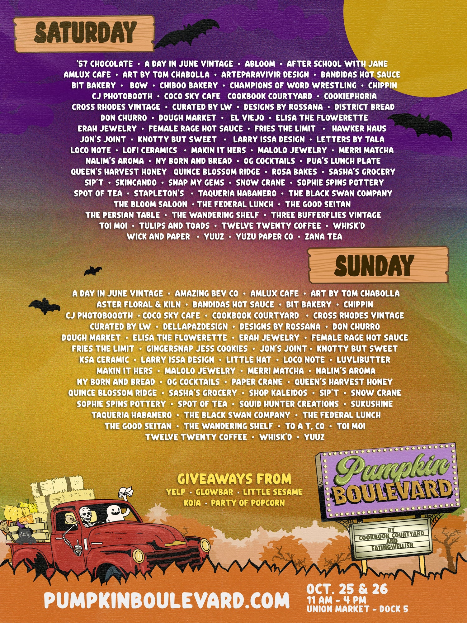 Step into Dock 5 at Union Market and discover over 60+ incredible vendors, serving up seasonal flavors, spooky treats, handmade goods, and festive experiences that capture the magic of this season. From pumpkin-spiced everything to locally made crafts and family-friendly activities, this is the can’t-miss event of the season.